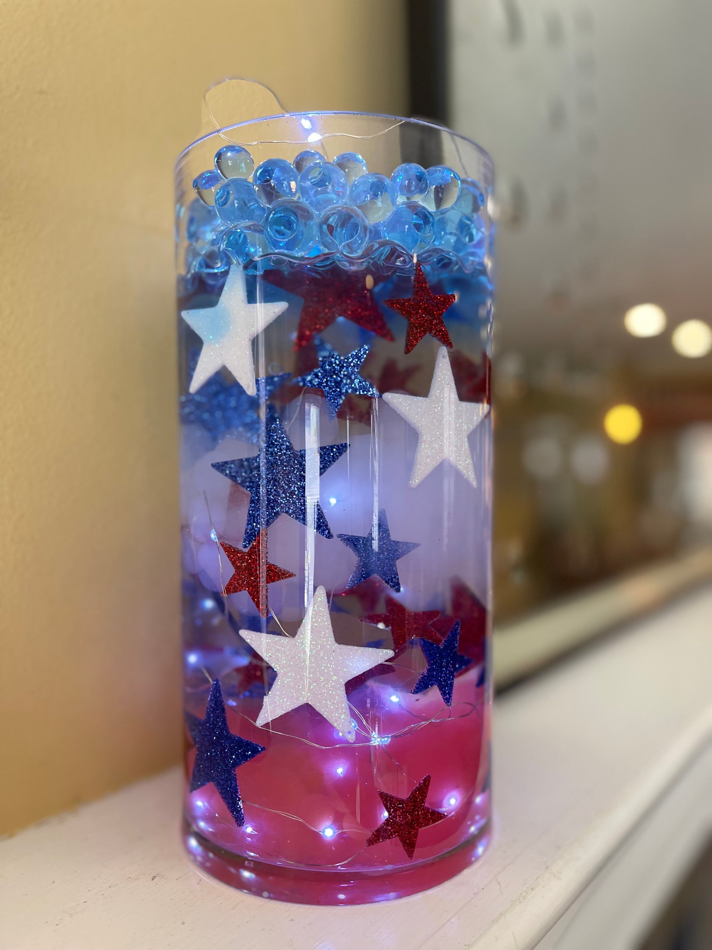 - Each Pack fills 1 gallon of the Floating Stars for your vases and contains: 30 resin Stars in Glitter Red, Silver, & Blue, 20+ Red/Blue Color Effects Gels & 25+ Floating Stars Confetti! Plus 1 Pkt Transparent Water Gels Measured Floating Kit, must-have for best-floating results, including our exclusive measured Prep & Storage Bag (leak proof)! Option of 3 Submersible Cool White or Warm White Fairy Lights Strings. See the Fairy Lights image for more details